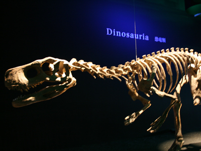 さて、最初の円形の部屋を抜けると、さっそく恐竜様のお出ましだ。暗い会場の両脇に、鮮やかにライトアップされ、白く浮かび上がる巨大な骨格標本たち。誰もが思わず「かっこいい!」と目を輝かせてしまうに違いない。ストロボを焚かなければ、写真を撮ることも可能だ。ただ、ここで着目していただきたいのは、陳列されている骨格標本のすべてが恐竜のものというわけではない、ということだ。ここには、恐竜と同じ時代を生きた私たちほ乳類のなかまであるキノドン類や、ワニ類のなかまも一緒に展示されている。