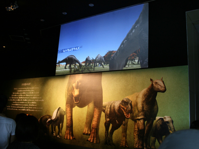 最初の円形の展示室で、私たちを取り囲んだのは、月面のような壮大なパノラマの映像だ。今回展示されている化石が発掘されたのは、世界遺産として有名なアルゼンチンの「イスチグアラスト州立公園」。そのゴツゴツとした月面のような光景から「月の谷」と呼ばれる一帯もある。円形の室内に360度映し出されたパノラマ映像がグルグルと回転し、私たちの意識を日常から遠く離れた場所へ運んでいってくれる。また、会場の各所に設置された大型ディスプレイには、精緻なCGで描かれた恐竜たちが画面いっぱいに動き回り、その迫力は子どもたちの目を釘付けにしている。