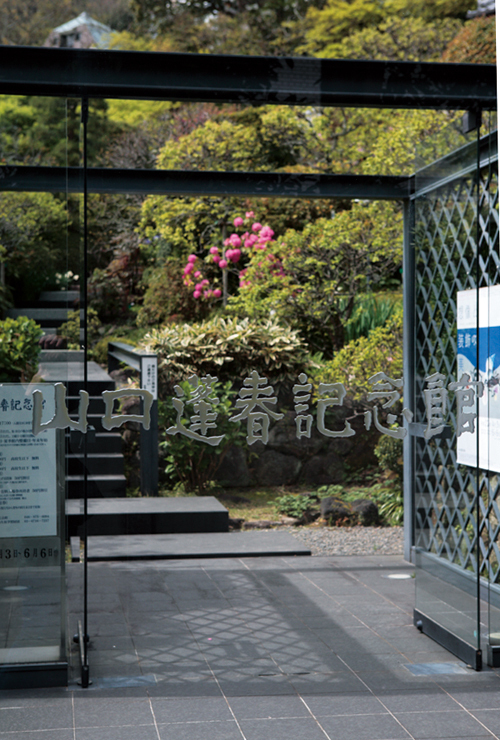路地に入って角を曲ると、いきなり大きなガラス板が立っているので驚いた。艶消しの黒い鉄枠でしっかり囲まれ、ガラス面にはこの記念館の名が刻まれている。狭い路地にずいぶん大胆だ。でもガラスなので背景の庭や山々が素通しで、圧迫感はなく、むしろ気持いい。巨大なファインダーをのぞくみたいだ。目障りな建物は何も見えず、ここは美術の記念館だというそのお知らせだけが示されている。