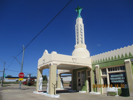 4月18日(月)。ルート66旧道が通っているテキサス州北中部の田舎町Shamrock。1936年に建てられたガソリンスタンド&ドライブインが現在は博物館兼観光案内所となっている。