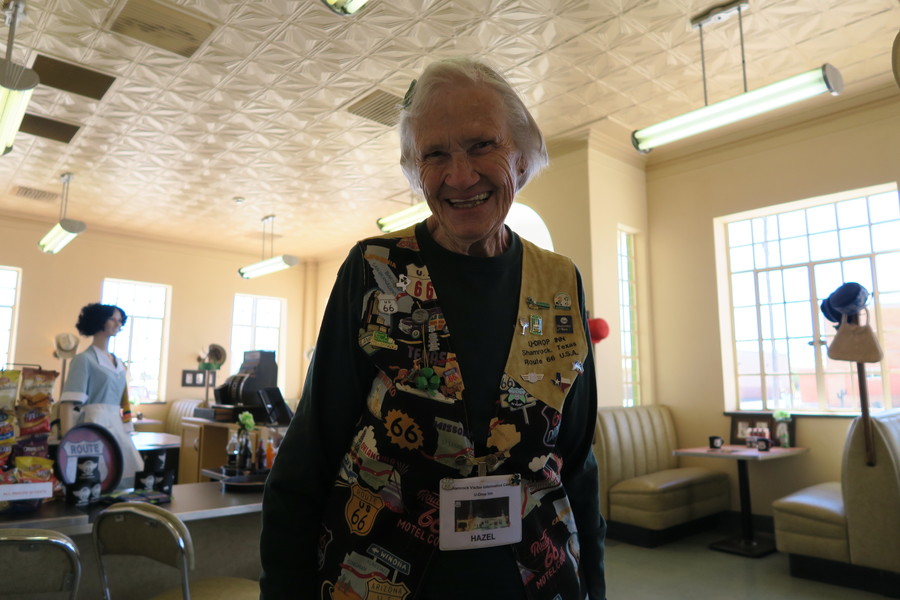お年寄りのボランティアが親切に対応してくれる。ヘーゼル・ジャンセンさんは81歳、旦那はオランダ系、ヘーゼルさん自身はスカンジナビアと英国のハーフ。この観光案内所はルート66沿線でも屈指の人気スポットらしく年間なんと1万6000人もの観光客が訪れる。4月は比較的閑散としているがハイシーズンの7~9月には案内所は観光客で溢れかえるという。