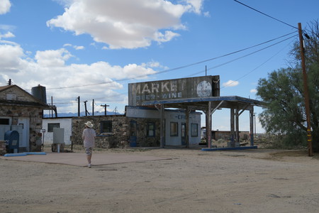 廃墟となった郵便局、ガソリンスタンド、雑貨屋、モーテルなどが旧道沿いにまばらに残っている。速度を落として観察しながら走っていると煙突から煙が出ている建物があり、さらにポンコツのキャンピングカーにも人が生活しているようだ。