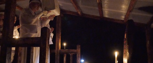 洞窟の暗闇の中、ろうそくのあかりだけで人穴内の祠にお参りをした。