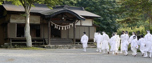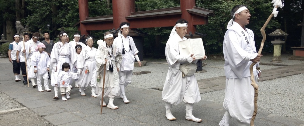 参加者は約20名。老若男女、最年少は2歳から、ご老人は70代まで。お宮での出立祭を経て、先頭に提灯、先達、ご神鏡を担ぐ神輿と続く。みな白い山装束で金剛杖を付き「六根清浄」の掛け声で進んで行く。
