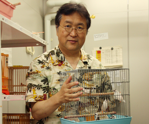 岡ノ谷一夫氏。 抱えているのはジュウシマツ。研究室ではジュウシマツやキンカチョウのほか、デグー(ネズミの仲間)なども飼育。