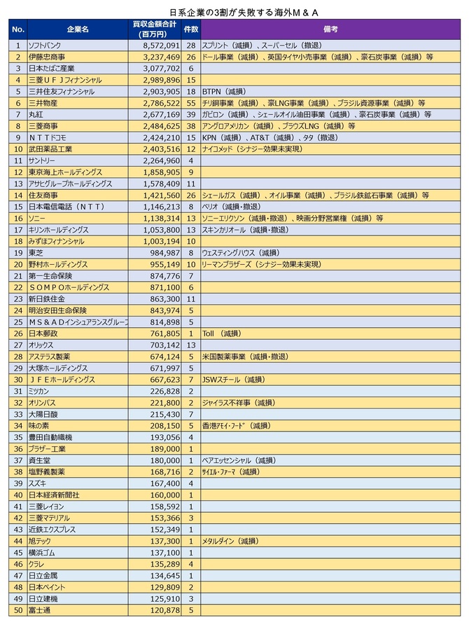 2000年から16年末までの17年間に、海外のM&Aを実行した企業を買収総額の大きさ順に100社をあげて計算してみると、買収額の単純合計は実に73兆円に上り、1件当たりの単純平均買収額は1000億円を超える。まさに社運を賭けた超大型M&Aと言っても過言ではないだろう。しかし、表の備考欄の通り、減損や撤退など想定外の事態に直面している企業が実は3割も存在する。日本企業の海外M&Aのどこに原因が存在するのであろうか。