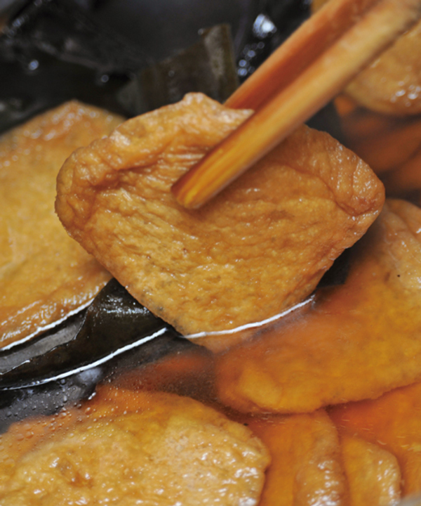 きつねうどんについていえば、油揚げは京都錦市場の「近喜(きんき)商店」から仕入れ、菜種油で揚げ直したうえで、2時間かけて油抜きをする。その後、甜菜糖(てんさいとう)、塩、昆布などと1緒に、3日かけて炊く。