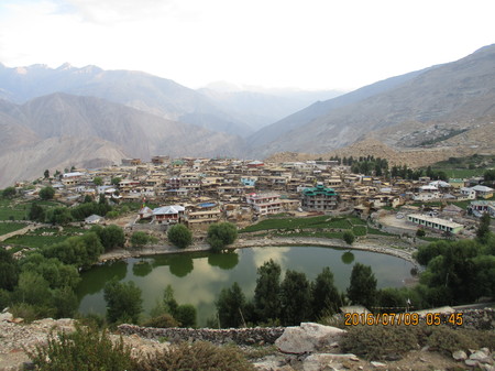 7月11日。ナコからさらに北に位置する中国国境のタボに移動。インドのローカルバスではおなじみタタ社製の旧式大型バスである。標高3000~4000メートルの高度を大半が未舗装の道路が続く。眼下の遥か下にはスピティー渓谷の茶色い濁流が渦巻いている。このスピティー川の激流に削られた荒々しい渓谷の急峻な山道を気息奄々とローカルバスは進む。
