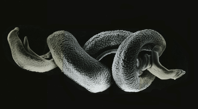 ——いえ、住血吸虫症の研究です。これはいまでも私のメインのサブジェクト。 住血吸虫は人が川や湖の水に浸かるだけで感染します。体長約1㌢で太さ1㍉くらい。成虫ではオスの体にメスが挟まった状態で仲良く生きています。これが人間の血管に住む。種類によって好む場所は決まっていて、たとえばマンソン住血吸虫は腸間膜静脈、ビルハルツ住血吸虫は膀胱の静脈が居場所です。