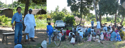 現地住民に住血吸虫の感染予防を訴える嶋田教授。
