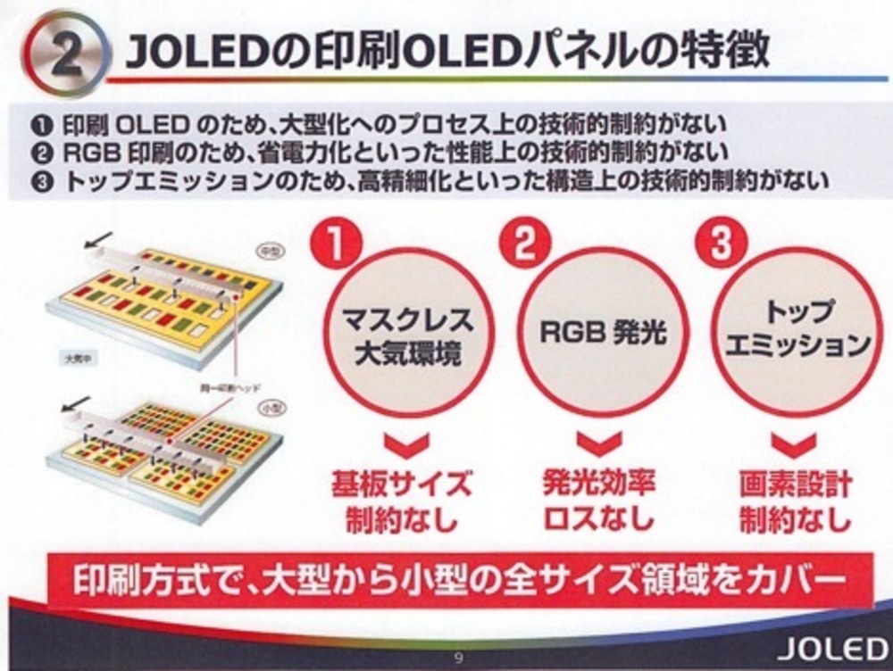 2014年、印刷で技術開発をしてきたパナソニックと、蒸着で技術を開発をしてきたソニーが一緒になってできたJOLEDが選んだのは「印刷」だった。開発スピードを取るなら、「蒸着」だったことは想像に難くないが、JOLEDが採用した技術は「印刷」。