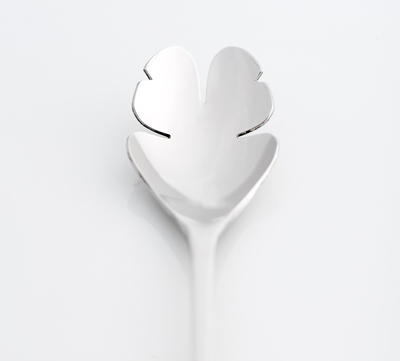 スプーンの切れ目は先端だけでなく、左右にも入っている。これは卵を割った際に、カラザの位置がさまざまに変わるためで、その位置によっては横の切れ目が有効となる。永田は、色々なパターンを繰り返して最終形に仕上げたが、その形がクローバーに似ていたことから商品名にもした。