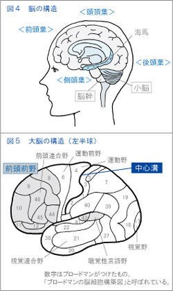 脳の表面にある大脳皮質は前から順に4つの領域、前頭葉、頭頂葉、側頭葉、後頭葉に分けられます。さらに、脳は52の領域に分けられ、それぞれ番号がつけられています(図5)。これは20世紀の初めごろ、ドイツの解剖学者のブロードマンが、神経細胞の構造の違いを分析してつけたものです。当時はまだ、それぞれの働きまではわかりませんでした。しかし最近は、MRIの発達により、どの領域が体のどの部分と関係して、どんな働きをしているかなど、詳しくわかるようになってきています。