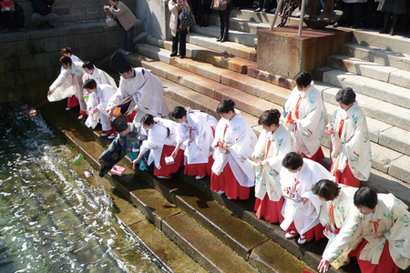 神事の開始は13時から。神前に紙雛を供えた後、祝詞(のりと)を奏上し、神楽を奉納。拝殿内の水庭(すいてい)には、男性は狩衣(かりぎぬ)、女性は千早(ちはや〈神事用の衣装〉)を着用した、地元の句会や歌会の代表者が参集。水に浮かべた杯を手に取り、お神酒を飲んで歌や句を詠む、みやびな「曲水(きょくすい)の宴(えん)」が繰り広げられる。