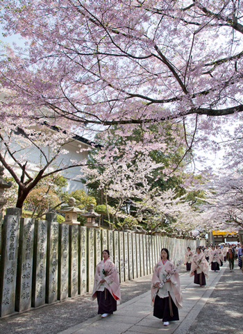 古くから「こんぴらさん」の名で親しまれてきた香川県の金刀比羅宮(ことひらぐう)。江戸時代に「一生に一度のこんぴら参り」が庶民の間に広まり、今も多くの参拝者が全国各地から足を運ぶ。御本宮まで、全部で785段の石段が続くことで知られる参道で、毎年4月10日、春の訪れを告げる「桜花祭(さくらさい)」が執り行われる。