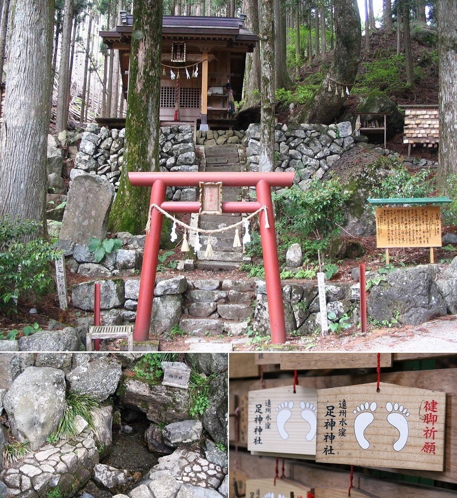 神社から少し下ったところに、足神様の御神水と呼ばれる水が湧き出ている。足の病に効くという言い伝えがあり、この水を求めて遠路はるばる訪れる人も少なくない。足を故障したサッカー選手がお参りに来たこともあるそうだ。北遠随一の冷たさとも言われる湧き水に手をかざし、そっと足につけてみる。道中の疲れが、これで少し和らぐだろうか。