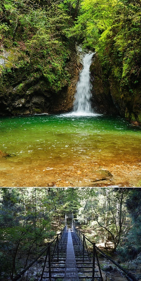 両側を120mの絶壁に挟まれ、大量の水が轟音とともに翡翠色の滝つぼに流れ落ちていく。背後に広がる断崖は「犬地獄」と呼ばれ、犬さえも躊躇して入ることができないと言われる原生林が広がっている。その深遠なさまに、思わず息をのむ。村人たちが一心に祈った龍王権現の姿が、今にも立ち現れてくるようだ。