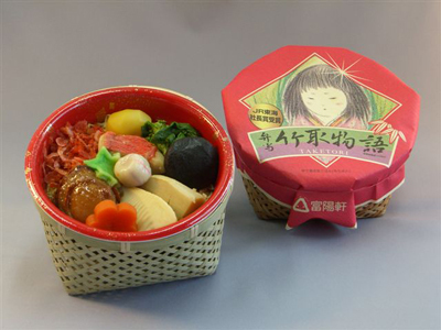 不死の薬が入っていたかもしれないような竹製のかごを、割竹の中でちょっとうつむき加減な、小さくかわいらしい女の子を描いた掛紙で包む。ふたを取ればタケノコ、ホタテ、クリ、サクラエビ、キンメダイなどの、これまた小さくかわいらしいおかずが現れる。その下には、ゆで落花生が入ったおこわが敷き詰められている。