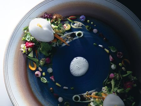おいしさの先の感動を求めていると米田は言う。心が跳ね上がるのは、コース前半の「地球」という一皿。直径60センチの大皿には、姿も温度もさまざまな生野菜、温野菜、ピュレなど60種類もの野菜が細やかに息づき、アサリエキスの白いエスプーマ(泡)が雲のように浮かぶ。緑が雲を呼び、雲が雨を呼んで生命を育むという地球の循環を表現した一品は、しばし眺めていたい絵画のようだ。が、温度差にも込められたメッセージを感じるために、すみやかに舌で味わう。主旋律で動き出した感情が、時に軽快に、時にゆったりと、時に激しく一皿ごとにからまりながらメインに向かって高まっていく……というのは、これまでにない経験である。