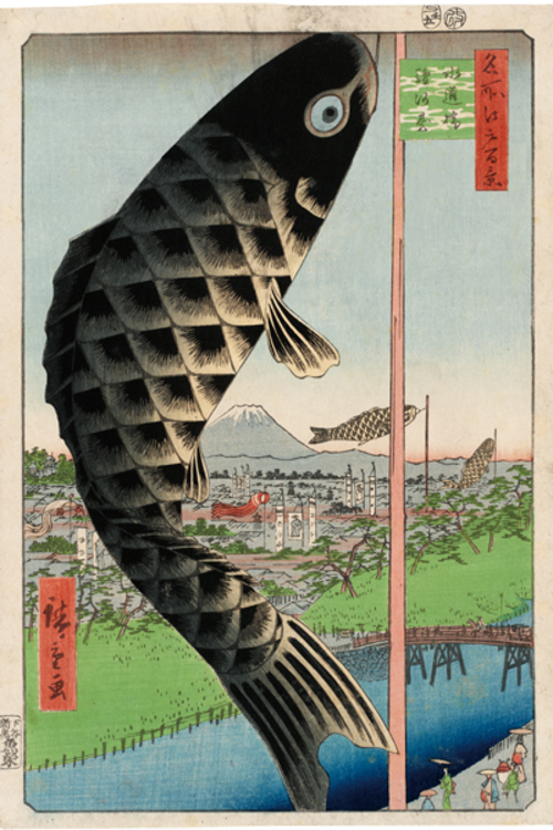 お江戸の鯉のぼりは「真鯉」だけ。緋鯉のお母さんや子供たちが登場するのは、ずっと後の世のことで、当時は1匹だけの鯉のぼりでした。歌川広重さんの「名所江戸百景 水道橋駿河台(すいどうばしするがだい)」は安政4年(1857)の作 品です(①、⑧)。