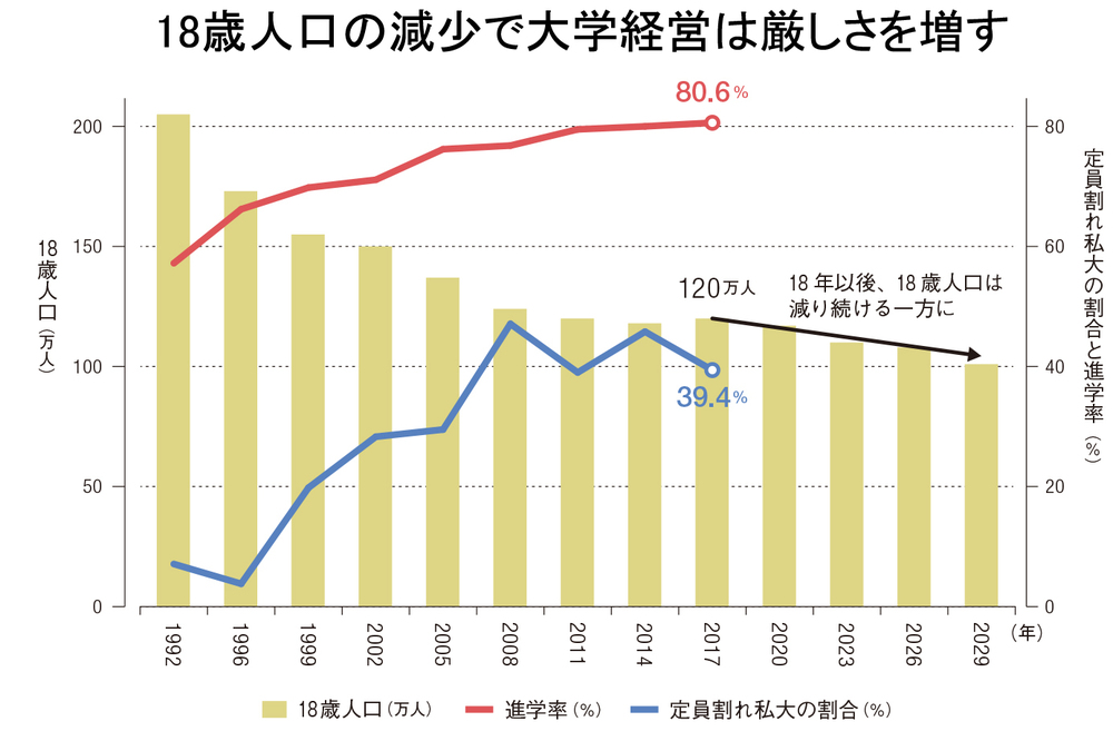 日本の18歳人口は、ピークだった1994年の205万人から次第に減少し、近年は120万人程度を維持していた。ところが、2018年から再び減少に転じ、31年には99万人と100万人をも下回る見通しである。さらに大学、短期大学、専門学校、高等専門学校4年目の合計の進学率は約81%(17年度)と頭打ちである。他方、私立大学・短大数は932校にも及び、定員割れの学校数も229校と約39%にも達する(下記グラフ参照)。また学校法人の17%が経営難に陥っている。