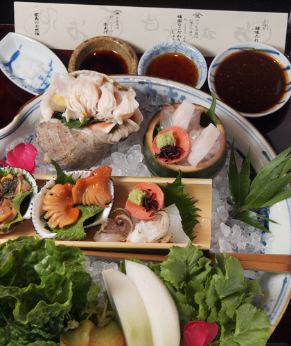 真里のお造り。新鮮な魚介や野菜を、地元で製造された多彩な調味料で味わえる