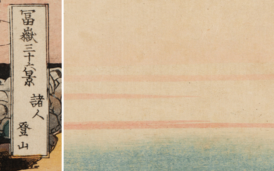 葛飾北斎さんの「冨嶽三十六景 諸人登山(もろびととざん)」は、シリーズ46枚の中で唯一、富士山の美しい山容がどこにも描かれていない作品です(①)。天保2年(1831)頃、北斎さんが古稀(70歳)過ぎに描きました。