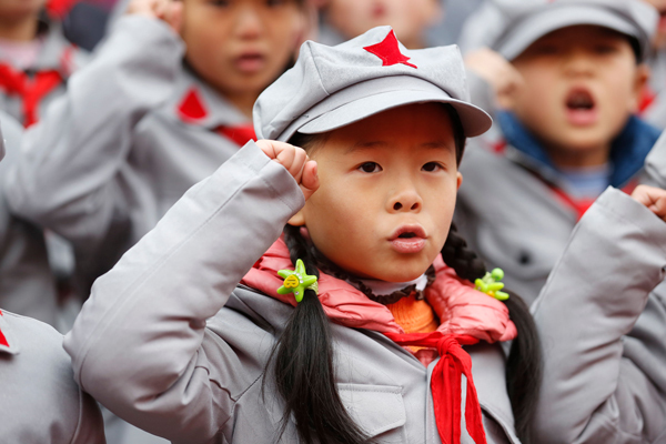 「東の空が紅く輝き、太陽が昇る。毛主席の英明な指導によって草原は解放された。至るところに紅旗が翻り、農民は地主を倒し、農地を分け合い、喜びの気が充ち溢れる。児童団は喜び勇んで地主と富農の監視活動に努める」と書き出される。最初の数行からして、すでに「毛主席の英明な指導」である。こうなったら文革当時の「毛主席、万歳、万歳、万々歳!」までは、もう一歩だろう。いや、子供の世界では大人の世界に2年程先んじて文化大革命が始まっていたとも考えられる。