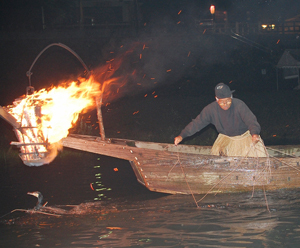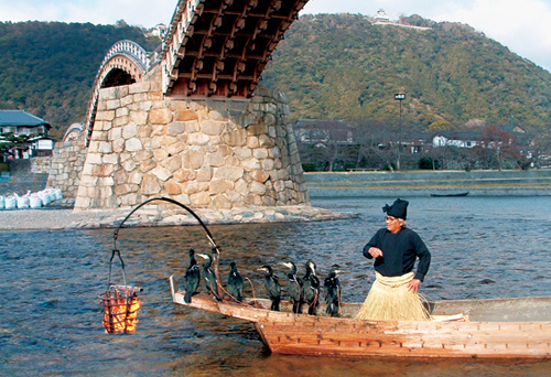 鵜を使って魚を捕る伝統的な漁法の歴史は古いが、この地の鵜飼について最初に記述があるのは1638(寛永15)年で、それは錦帯橋を架橋した第3代岩国藩主、吉川広嘉〔きつかわひろよし〕公の青年時代のことだという。錦帯橋の鵜飼はそのころの姿を再現しており、鵜を操る鵜匠の服装は頭に風折烏帽子〔かぜおれえぼし〕、腰には蓑〔みの〕を着け、舟は平底の木造船、赤松の篝火〔かがりび〕に、屋形船の提灯〔ちょうちん〕には蝋燭〔ろうそく〕が使われる。広嘉公も目にしたであろう、400年近く前の鵜飼の風情をそのままに楽しむことができるのだ。