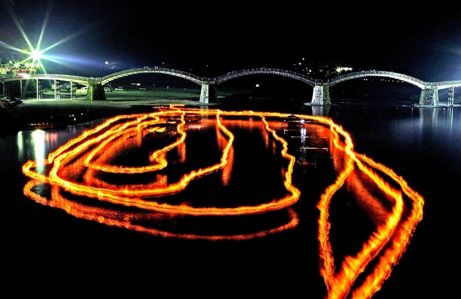 鵜飼舟の篝火が錦帯橋を幻想的に演出