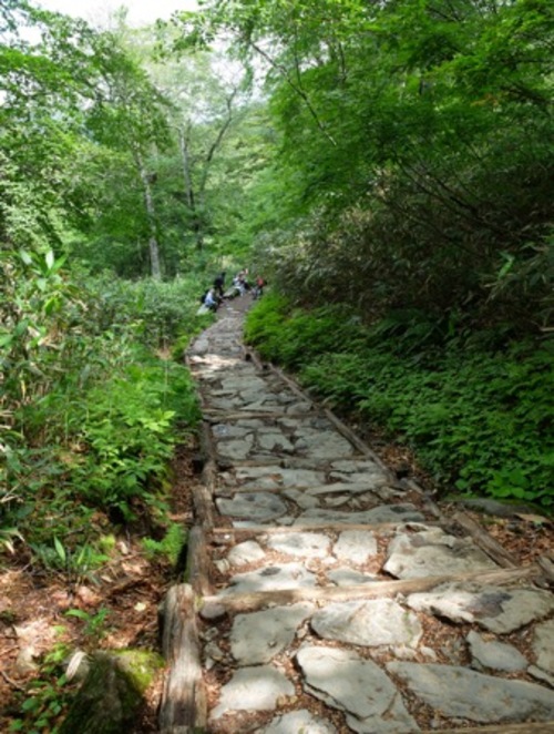 時々、他のパーティーと出会います。2本の木道は右側優先と決められていますが、日本人にとっては当たり前のことで、阿吽の呼吸の元、挨拶を交わしながらすれ違います。日が高くなるにつれ、山にかかった霧は晴れていき、あざやかな稜線が美しいです。帰るのがいやになる一刻でした。