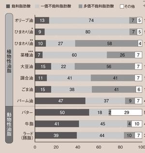 日本人がよく使う植物油(菜種油や大豆油、ごま油など)の脂肪酸組成は動物性油脂とは大きく異なり、オリーブ油に近い