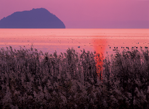この尾上〔おのえ〕付近の冬の風景を三十一文字〔みそひともじ〕に集約すれば、この歌になる。さっと特質を詠んだ簡潔さが素晴らしい。湖北といえば、冬、吹きつける風は時に雪や霙〔みぞれ〕を伴い寒く、枯れた葦の間に水鳥が群れて浮かんでいる。万葉の時代も今も変わらない。この普遍性も嬉しい。作者は、若湯座王〔わかゆえのおおきみ〕。この一首を残すのみで、それ以外はわからない。歌にある「津乎の崎」は、平安時代の辞書『和名抄〔わみょうしょう〕』に「近江国浅井郡都宇」とあり、「津乎」を「都宇」と考え、この尾上付近の歌とするのだが、他の場所を想定したり未詳とする見解もある。また、「湖風」の「湖」は、「みなと」と訓む。