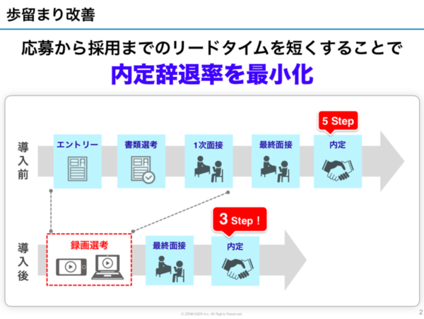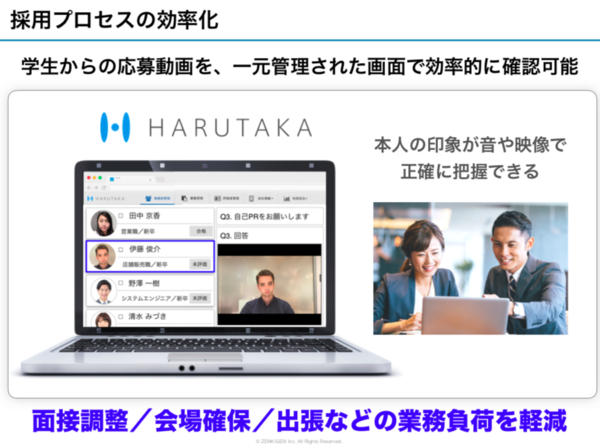 地方から時間と費用をかけて移動してきた応募者はなおさらです。一方、新卒世代のスマホ慣れ、SNS発信慣れ、セルフィーでの撮影慣れに注目し、「自撮り面接」「録画動画面接」という発想に行き着きました。起業半年前からシステム開発に着手、昨年10月の起業と同時にベータ版での販売を開始、そのスピードにも全機現を感じます。 自身が応募者を面接する際に感じていた問題には、「時間の無駄が多い」ということもあったそうです。数千人規模で面接していると、数分会話をするだけで、自社のカルチャーにフィットするか? ビジョンにマッチするか? は判断ができるようになる。しかし、大抵横並びで面接し、全員と40分〜50分「お互いに無駄な時間を」を費やしている。