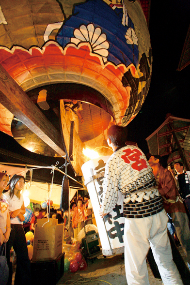 「大提灯まつりは、提灯が主役の静かなお祭りです。そのなかで見どころとなるのは、御神火を大ろうそくに移し、提灯に火を入れる献燈祭(火入れ式)です。また、お祭りの朝に組んでおいた屋根、そして提灯を引き上げるところも、興味深いのではないでしょうか」