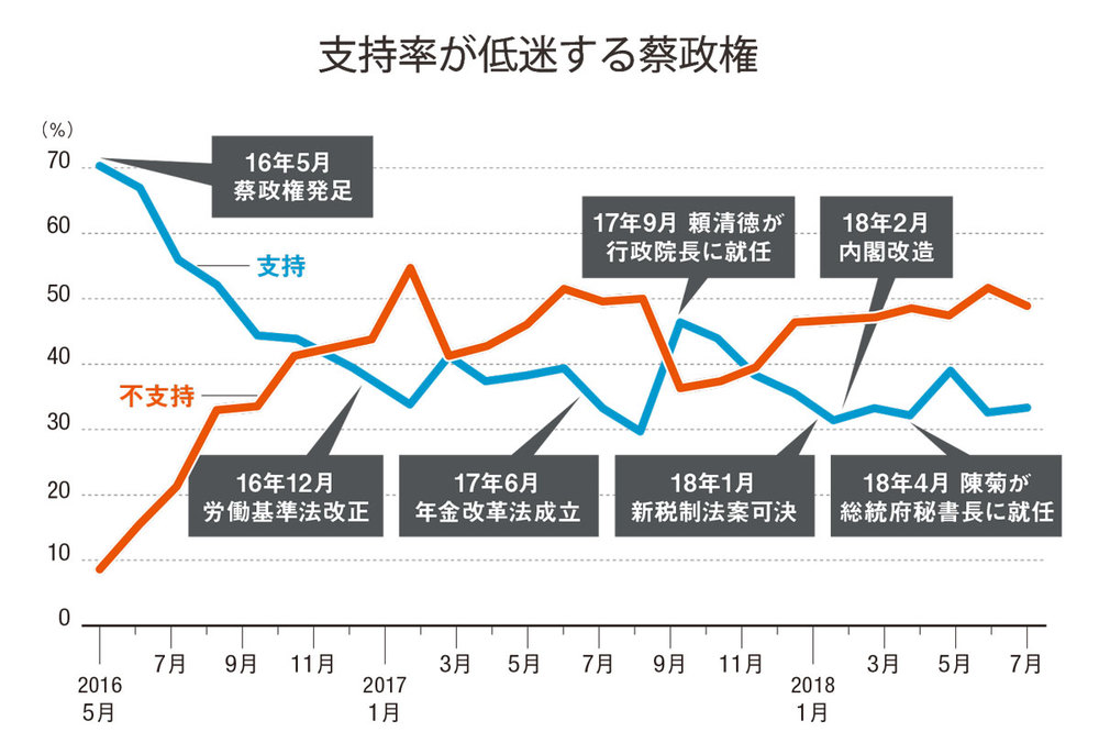 蔡政権は、16年に地滑り的勝利を収めたものの、就任後半年もしないうちに支持率が低落し、今や30%程度でほぼ固定してしまったからである。もしも統一地方選挙で敗北するなら、蔡英文は民進党主席を辞任しなければならなくなり、蔡英文への求心力は失われ、20年の再選に黄色信号がともる。