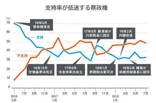 蔡政権は、馬英九・中国国民党(国民党)政権に対する怨嗟(えんさ)の声から誕生した。つまり、伝統的な支持層から中道の有権者にいたるまで、現状変更の強い期待の下に誕生した政権である。言い換えるなら、支持率低下は、いくつもの異なる期待に反した結果である。