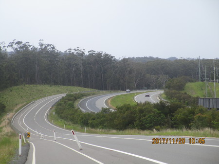 11月16日。相変わらずの雨模様の一日であった。レイク・キャッシーの海岸の公園のバーベキューハウスでテントを撤収してから幹線道路のルートA1、パシフィック・ハイウェイに戻り一路北上。相変わらず悲しくなるほど強い向かい風(北風)に気持ちが折れそうになる。単調な丘陵地帯が延々と続く。つまり上り下りの連続だ。しかも人がほとんど住んでいない広大な森林で覆われた丘陵地帯である。午後1時頃、道路脇に設けられた停車スペースで、小雨の中をポテトチップとチョコバーを立ち食いしてエネルギー補給。