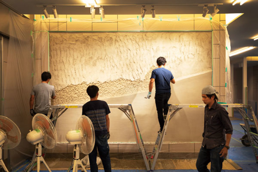 小さくうなずいて脚立に上がった久住は、壁の上部をやおら金槌で叩いて削り出した。床に敷いたシートの上に土がバラバラと音を立てて降り注ぎ、休みなく金槌を振るう久住の右腕の動きにつれて壁の表情がみるみる変わっていく。やがて、右上から左下に斜めに入ったラインから上は無数のエネルギーが湧きたつような印象に、そして下部は鏝で丁寧に押さえられたなめらかで穏やかな顔が出来上がった。