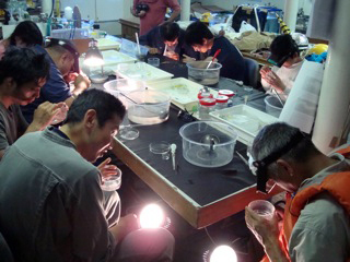 ウナギの卵と稚魚の選別作業に、研究者は黙々と取り組んでいる。