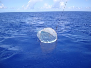 調査には直径3メートル、長さ15メートルの巨大なプランクトンネットを用います。動物プランクトンや魚卵、仔魚などを採集するため、網の目合いは0.5ミリと非常に細かいものになっています。これを海中に投入し、指定の深度で1時間半ほど曳網するのです。
