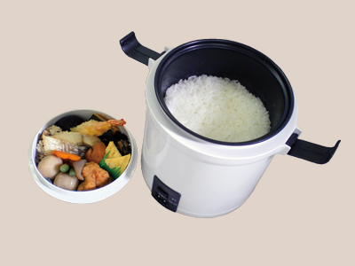 根強い人気のある保温式弁当箱を思わせる小ぶりの炊飯ジャーに、ご飯を炊く時の蒸気でおかずを温める樹脂製のケースを釜の上部に装着できるようにしている。炊飯の容量は0.5合から1.4合までで、2人用としても十分使える。