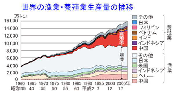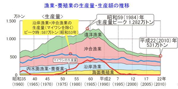 戦後日本は、高度経済成長と共に、世界最強の漁業として世界各国の漁場に進出し、シーフードチャンピオンの座を手にした。しかし、1982年の国連海洋法条約により、状況は一変した。条約で各国の海岸線から200海里(約370km)がEEZ(排他的経済水域)に設定されたことから、“海外の漁場の開拓”ができなくなり、漁獲量が激減。