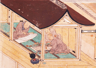 重文『慕帰絵詞(ぼきえことば)』〔部分・行状絵を制作する覚如〕 南北朝時代・観応2(1351)年 京都・西本願寺所蔵 ※展示期間:11/8~20
