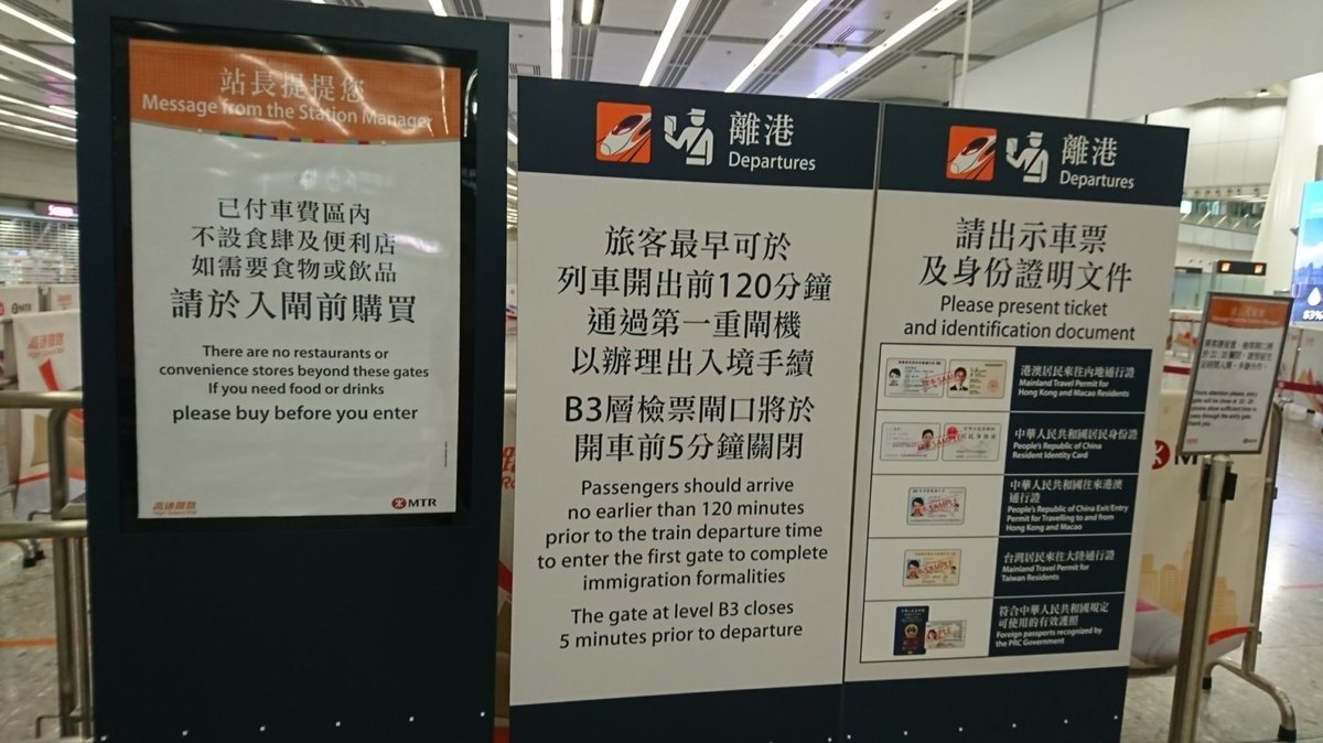 係員によると、当日は混み合う可能性があることと、出入境手続きに時間がかかるため、1時間半前には改札口の前に到着しておいたほうがいいとのこと。ホームページなどには「45分前までに」と書いてあるが、実際、香港の「離港(departures)」前に立つと、掲示板には出発の2時間前には到着しておくべきと明記してあった。やはり、出入境の手続きを伴うので、こうしたところは航空機並みだ(ちなみに、中国は国内の高速鉄道でも改札の締め切りが早いため、チケットをすでに持っていたとしても、少なくとも30分以上前には到着している必要があり、日本の新幹線のような“飛び乗り”はできない仕組みになっている)。