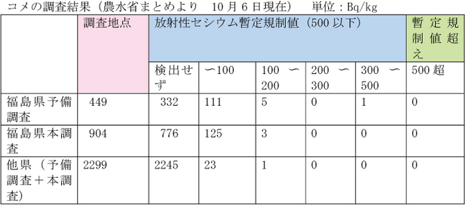 福島県によれば、コメの予備調査で二本松市の玄米から放射性セシウム134が220Bq/kg、放射性セシウム137が280Bq/kg、検出されました。穀類の暫定規制値は500Bq/kgで、この数値ちょうどの結果です。