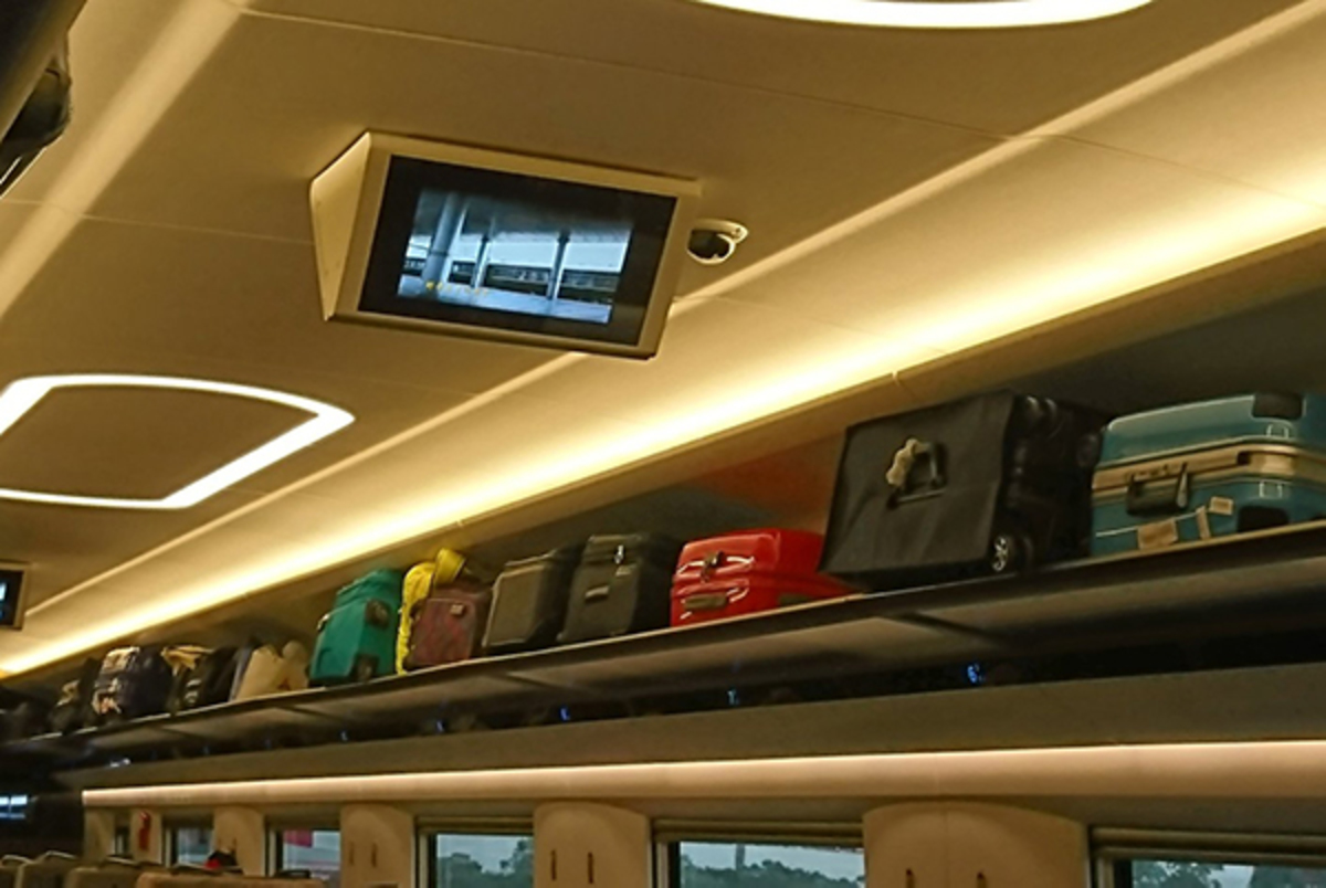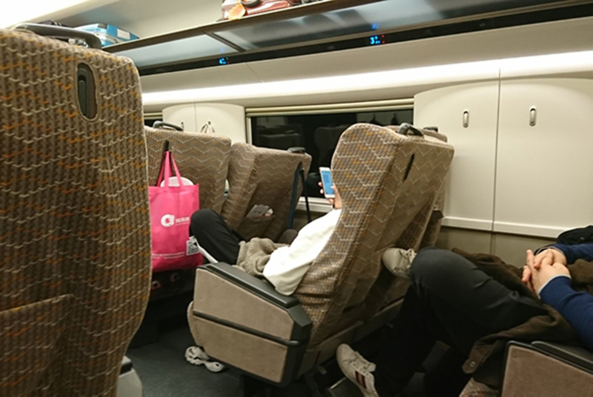 車両と車両の間には専用の荷物ラックがあり、ここに数個のスーツケースを収納することができる。この点は日本の新幹線との大きな違いだ(日本でも一部の車両には設置されているが、まだ数が少なく、大きなスーツケースを持って移動する外国人のインバウンド客にとっては不便)。ラックに荷物を置くのは早いもの勝ちで、すべての乗客の荷物を収納することはできないが、飛行機の機内持ち込みサイズと同じく、40リットル以下であれば、座席の上の荷棚に持ち上げて置くことが可能。私は荷物が少ないので、荷物ラックではなく、座席の上の棚に持ち上げた。見渡すと、ほとんどの人が自分の目の届く荷棚に荷物を乗せていた。