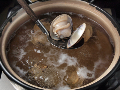 説明と共に登場したのが鍋。おだしが入った鍋である。火にかけて、見事なまでに大ぶりなハマグリを投入し、しばし待つ。口が開く。「そろそろ食べ頃」という女将の指示に従う。まさに口福。品の良い香り。ふっくらとして、程良い弾力。染みだしてくる滋味。馥郁(ふくいく)という言葉が浮かぶ。まさに馥郁たる香り、味わいなのである。そして、焼きハマグリほどの凝縮感ではないので、いくらでも食べられる。恐いくらい。