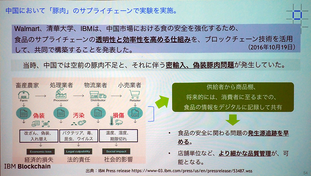 皆さんはブロックチェーンをご存じでしょうか? 仮想通貨から生まれた技術ですが、商品の追跡や食品の品質管理に利用できることが分かってきました。ビットコインの持つトレサービリティに注目しました。ブロックチェーンを使って、食品の流れを把握することで、過剰な供給による廃棄などの無駄を防ごうという試みです。これを衣料品に応用できれば同じように無駄を減らせると考えています。