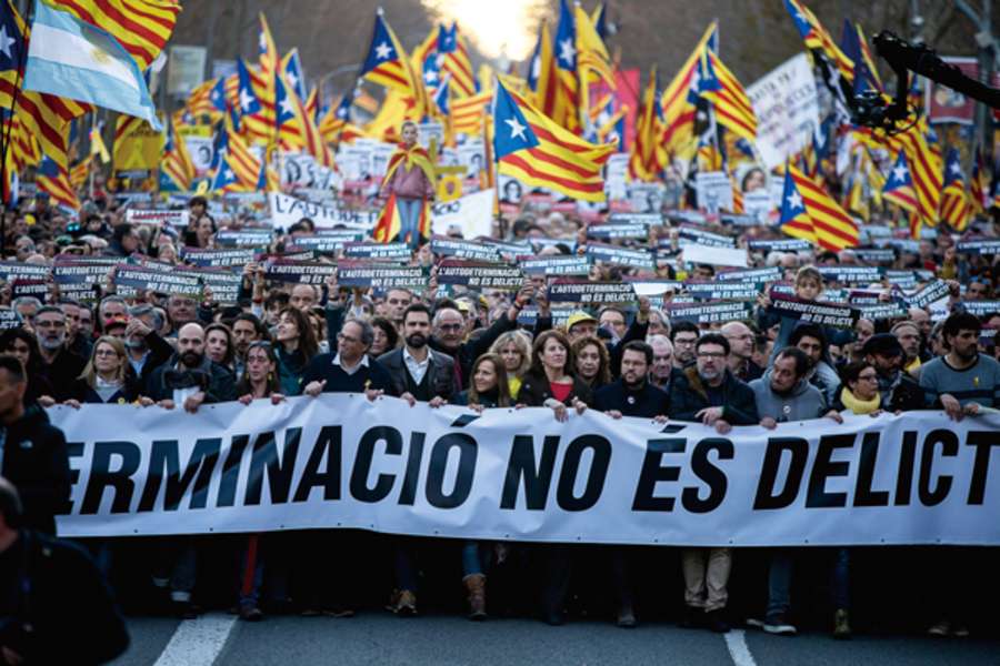 16日には州都バルセロナで大規模デモが開催され、20万人(地元警察発表)が参加。裁判への抗議と被告人全員の釈放を訴えた。参加者は独立の象徴とされる旗「エステラーダ」を振りかざし、「自治権は犯罪ではない」と書かれた横断幕を掲げた。自決権停止措置を下した中央政府に対し「政治腐敗」や「独裁」と叫んだ。